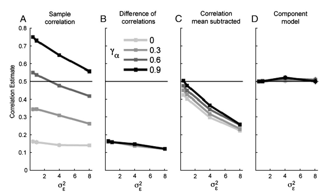 Pattern-component modelling yields estimates of the similarity of representational patterns that are not systematically distorted by noise and common components. Representational pattern similarity is measured here by the correlation across measurement channels (e.g. fMRI voxels) and is plotted as a function of the noise level (horizontal axes) for different amplitudes (shades of gray) of a common pattern component shared by both representational patterns. Figure from Diedrichsen et al. (2011).